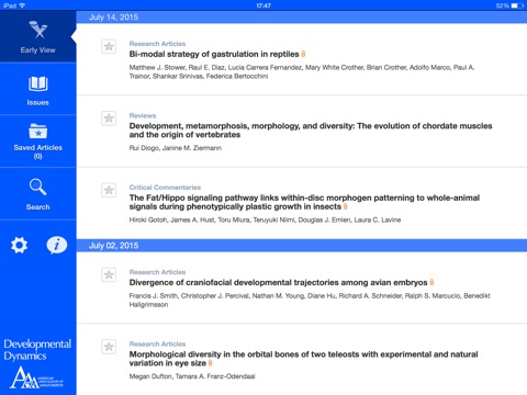 Now available on iPad and iPhone, “Developmental Dynamics” brings you a stimulating, high-impact mixture of Research Articles, Reviews, Commentaries, Perspectives, and more. Enjoy an entirely new browsing and reading experience, and keep up to date with the most important developments even faster: