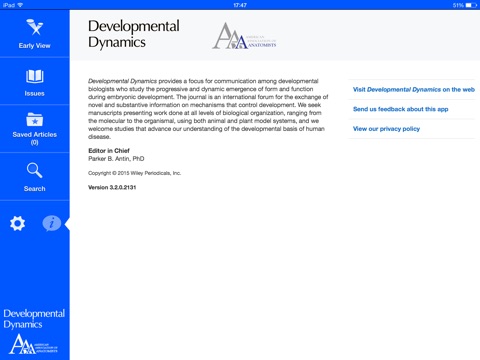 SUBSCRIBE IN THE APP: Annual Subscriptions (12 issues) for the iPad-only edition are available for $799.99 (US) per year. Payment is charged to your iTunes account after confirmation of purchase. Developmental Dynamics subscriptions automatically renew within 24 hours of the end of your subscription period for $799.99 (US) unless auto-renew is turned off at least 24 hours before the end of the subscription period. To turn off auto-renew, go to your iTunes account settings after purchase. Note that subscriptions cannot be cancelled during the term of the subscription, but you can still turn off auto-renew to prevent automatic renewal of your subscription. Note that any unused portion of a free trial period, if offered, will be forfeited when you purchases a subscription.