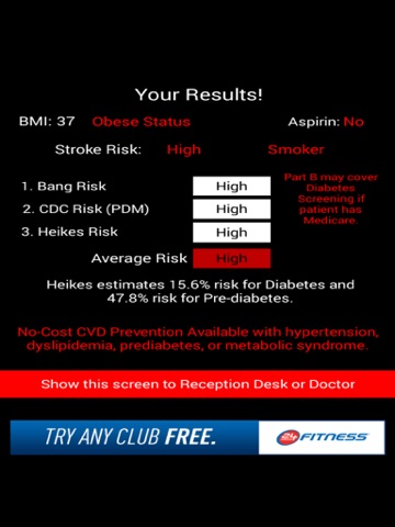 This app is in no way a replacement for advice from a medical professional like your doctor or nurse. The only purpose is to demonstrate your statistical risk factor for diabetes and pre-diabetes in adults. The only way to know for certain is to take a test like an A1C, FGT or IGT test.