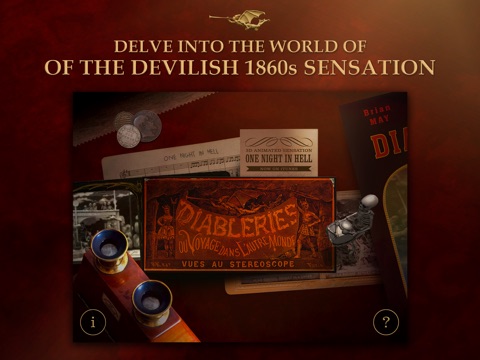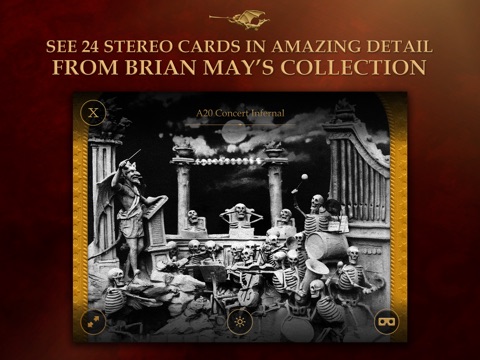 The cards, called Diableries (which translates roughly as Devilments), depict a whole imaginary underworld, populated by devils, satyrs and skeletons. Examine 24 Diableries stereo cards from Brian May’s private collection. Enlarge the cards in amazing detail with intuitive controls. Illuminate the cards transforming the view into a night scene, where the dark becomes enriched with colours that magically appear, and the eyes of the skeletons macabrely shine red and big, and follow you around.