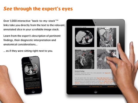 I am very excited about this application. First and foremost, the implementation is first rate; single finger seamless scrolling of excellent quality cross sectional imaging - as if you were at a PACS workstation, hyperlinks coordinating text with the findings, arrows to point out the findings (which can be turned off to help you make the findings yourself), and informative case info (history), findings, interpretation, and reference pages. This is the future of radiology education – not learned from a static picture in a book, but from dynamic image-sets simulating how radiology is actually practiced in the reading room; with an on-line tutor making sure you make all the findings and interpret them properly. The individual image datasets (e.g. axial or coronal CT) can be scrolled in their default 2 x 2 format shared with text on the page, or double-tapped to enlarge any of the 4 image windows, or maximized so the image takes up the entire screen. The scrolling is completely fluid – even at maximum screen size (I have iPad2), and it works with vertical or horizontal format, nicely transitioning as you rotate the device. The creators obviously understand the capabilities of the Apple iOS and are taking full advantage of them. The premise and text by van Leeuwen and Veldhuis are also excellent, presented as multiple cases you can pick and choose, or as a coherent textbook really delving into the anatomic analysis of abdominal imaging. As a third option there is an extensive index which points you to relevant cases. This is great for residents just learning body CT, or for seasoned radiologists who want to challenge themselves to really understand the anatomic basis of abdominal disease processes. What really appeals to me about this concept is that it lends itself to all types of radiologic image-based teaching; an addition to (or dare I say it) even a replacement for standard hardcopy radiology texts. And infinitely more interactive than a textbook or most lectures - instead of an image or two or a slide that flashes by so quickly you can’t process it, you get the entire case – delivered at your own pace. I understand the developers have designed this application such that developing content is very straightforward. This, combined with digital marketing through the Apple store means publication can be swift, and can come from numerous authors directly. No more years to edit and typeset textbooks that are immediately out of date – instead create, publish, use, update – in bite size bits or more comprehensive works. Fast and simple; I expect we will see a lot of timely and useful educational material in the near future, and I look forward to adding it to my educational collection.