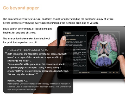 ▸ The app extensively reviews neuro-anatomy, crucial for understanding the pathophysiology of stroke, before interactively showing every aspect of imaging the ischemic brain and its vessels.
