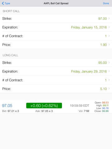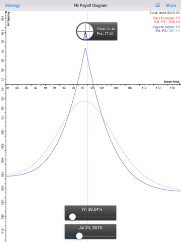 This app is very powerful in helping you make right decisions in options trading. It helps you watch the market through visualized market information and visualize your risk/reward of the option strategy. Using the Black-Scholes model to price options, Diagonal Spread Free draws / visualizes the payoff of options strategies and clearly presents how time decay impacts strategies. Play with the IV Slider and the Date Slider to watch the impact and evaluate your strategy further more. Also enjoy the dynamic, lightening fast, near Real-Time options chains.