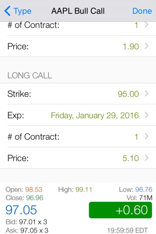 This app is very powerful in helping you make right decisions in options trading. It helps you watch the market through visualized market information and visualize your risk/reward of the option strategy. Using the Black-Scholes model to price options, Diagonal Spread Pro draws / visualizes the payoff of options strategies and clearly presents how time decay impacts strategies. Play with the IV Slider and the Date Slider to watch the impact and evaluate your strategy further more. Also enjoy the dynamic, lightening fast, near Real-Time options chains.