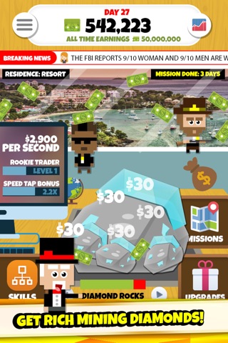 - Unlock Idle Upgrades, Skills, and Crew Members: Improve your diamond mining empire by hiring a variety of troops, upgrading incremental/idle production facilities, and sending your units on missions for business or governments to earn a large amounts of bonus cash for your clicker business.