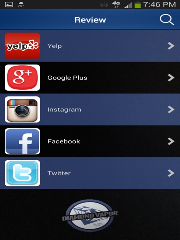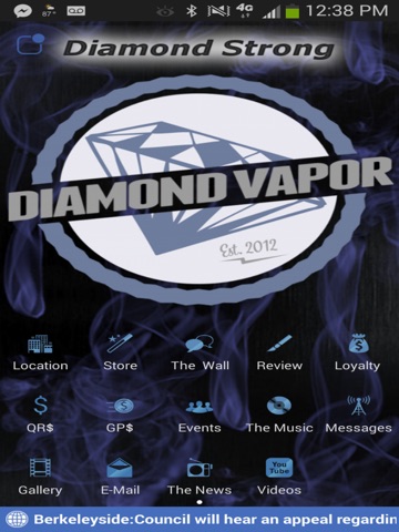 Diamond Vapor App keeps our customers connected with us while they are on the go.It features different coupon rewards for frequent visits. Push notifications with geo fencing feature to be informed about our latest products and events.It gives also to our customers other features like social sharing and a Wall for their comments and pictures. It has a music channel to entertain the customers while using the App. Also features a special tab for the News in real time all over the world about the electronic cigarettes industry.