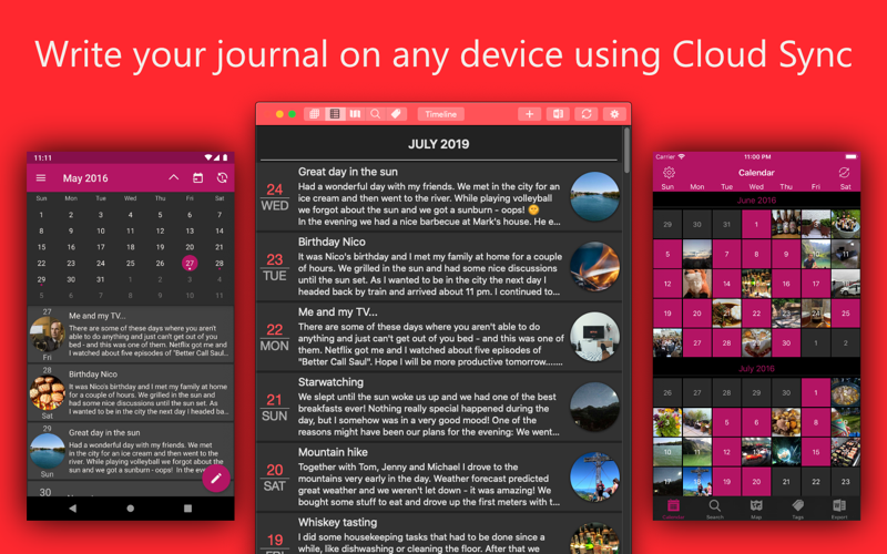 • Write your journal on any device (PC, laptop, tablet, phone, …) using Cloud Sync*