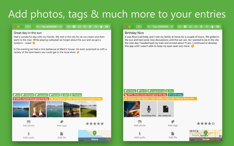 • Attach pictures, drawings, audio recordings, files, tags, people, ratings or locations to your diary entries