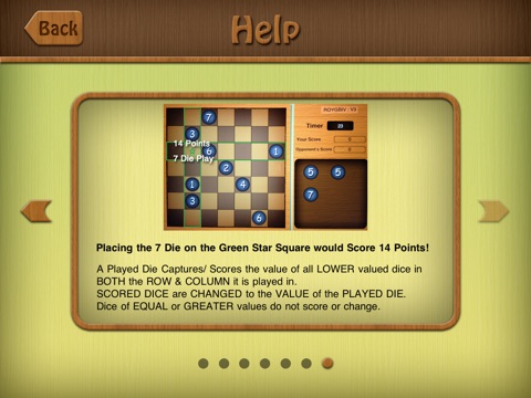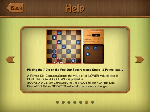 A played die captures/scores any lower value die in the ROW or COLUMN it is played in. The Player scores the total value of all captured dice, and the captured dice change to the value of the played die.