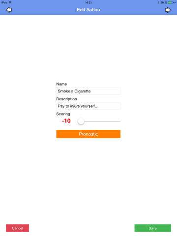 Add your actions in Diceepline, attribute some points ( negative or positive ) to each action, setup pronostics, and even costs…