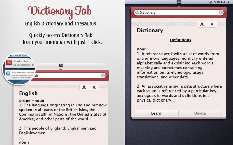 This app was exactly what I was looking for, a means of looking up a word without oppening another app just click, type and boom the word i was looking for is there without having to open the Mac default dictionary app. it lives in the menu bar and is there when needed. The one thing i noticed that ultimately kept me from rating this a 5 star was when I went to quit the App store I had already started Dictionary Tab, so when i hit command + Q it quit the dictionary tab rather than quiting the App store. Even when I started Dictionary Tab again and made sure that the app store was the active app, it still quit Dictionary Tab rather than the App Store. Frustrating and a little irritating but not enough for me to uninstall and demand a refund, just something to be conscious of when using the app for now.