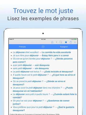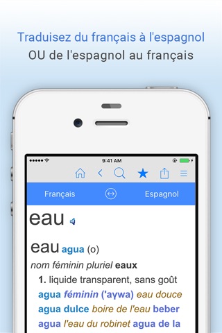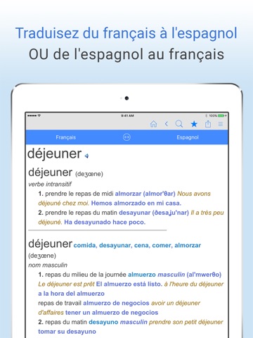 * Passez du mode traduction français-espagnol au mode espagnol-français en un seul geste.