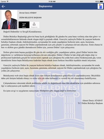 Didim Belediyesi Mobil Belediyecilik uygulamasıdır. Bu uygulama ile Didim sakinleri, belediyelerine akıllı mobil cihazları sayesinde diledikleri zaman ulaşabilecek, borçlarını takip edebilecek, istek ve şikâyetlerini istedikleri yerden, istedikleri zaman iletebileceklerdir.Uygulama sayesinde belediye ile ilgili güncel haberlere kolayca erişebilecek, e-belediye ile aşağıda ayrıntıları verilmiş tüm işlemleri kolayca gerçekleştirebileceksiniz: