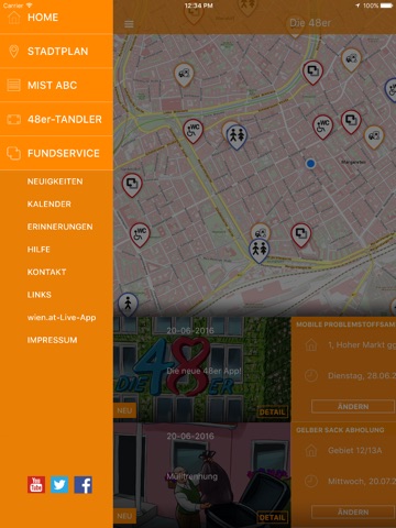 Von hier aus können Sie schnell auf den Stadtplan zugreifen. Auch die neuesten Nachrichten der 48er sowie das Erinnerungsservice für die mobile Problemstoffsammelstelle bzw. für die Abholung des gelben Sacks für Plastikflaschen (Einfamilienhäuser im 10. bis 14., 16. bis 19. sowie 21. bis 23. Bezirk) werden angezeigt.