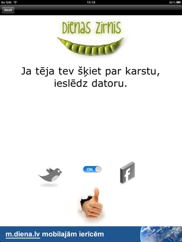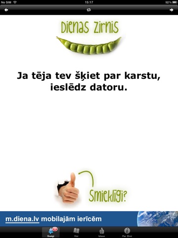 Dienas zirnis ir Egīla Zirņa izmeklētas sentences no 21.gadsimta tautas daiļrades pūra izšķirīgiem dzīves gadījumiem, it īpaši pirmdienas rītiem. Ieteicams lietot arī nedēļas pārējās dienās pie rīta kafijas kopā ar Dienu. Veselības aizsardzības ministrija brīdina: humora izjūtas trūkums nopietni apdraud jūsu psihisko un finansiālo labsajūtu.