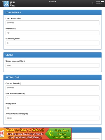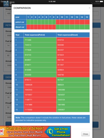 A simple app to compare the prices of Petrol car and Diesel car and display the breakeven point. Red indicates more expensive and green less.