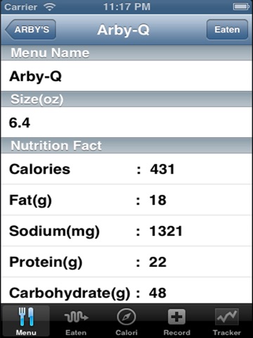 -.All nutrition facts such as calorie, fat, protein, carbs, sodium for each food item.