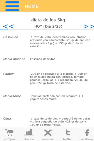 Esta aplicación te ayudará a seguir una dieta indicándote tu menú de hoy y de los siguientes días en las 5 comidas de la dieta que hayas elegido, también te dará la lista de la compra con los ingredientes que necesitas para tu dieta, y podrás guardar tu peso en una gráfica para ver tu evolución, motivarte y compartirla con tus amigos. Además podrás calcular tu peso ideal, tu índice de masa corporal (IMC) y tu consumo energético (de calorías) diario.