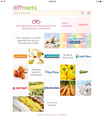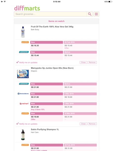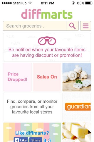 Search, compare, and monitor groceries, daily supplies from all the major supermarkets in Singapore (SG), including products available from ColdStorage, FairPrice, Giant, Redmart, ShengSiong, Guardian, and Watsons.