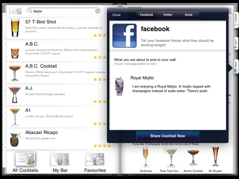 - My Bar feature, show all the cocktails you can make using the contents of your cabinet