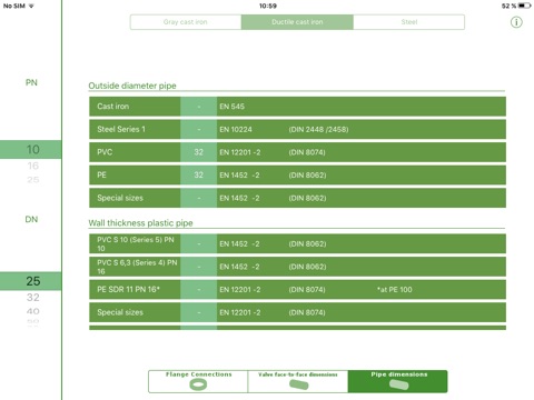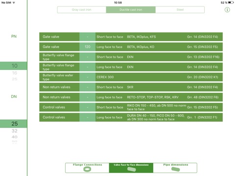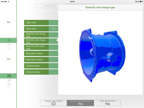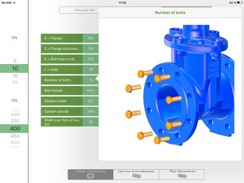 DigiFlange allows you to determine flange dimensions, face-to-face lengths of valves and pipe dimensions fast and easily. Use the scroll wheel to select the desired materials, nominal diameters and nominal pressures. DigiFlange shows you the related dimensions according to DIN standards, such as flange thickness, pitch circle or screw thread. If you click on the respective dimension, this will additionally be displayed as an explanatory picture.