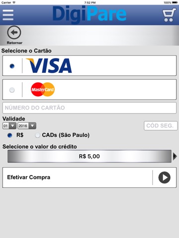 É possível também se cadastrar de forma simples e prática, comprar créditos utilizando cartões de crédito Visa e Mastercard, consultar seu saldo e extrato de movimentação.