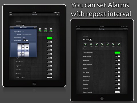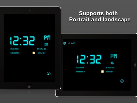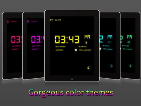 Digital Clock and Alarm turns your iPhone, iPod touch or iPad into a beautiful digital clock with various colorful themes and an alarm clock that sings your favorite tunes. It even displays live, local weather conditions and temperature that makes you know about the weather immediately when you wakeup.