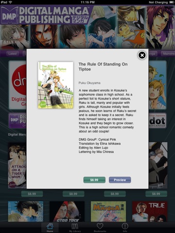 The scans are generally high-quality, and the app is easy to use. However, there are occasional glitches that can prevent you from reading your purchased material no matter how many times you restart the app. This would be less of a problem if there were A) a clear way of obtaining tech support or B) personal accounts that remember your purchases even if you delete the app itself. Both VIZ and Yen Press already have the latter, which is vital if you want your customers to feel secure when buying a digital copy of their manga instead of a physical one. Now that DMP is switching over entirely to digital releases, thats even more important. Its also worth mentioning that not all translations are up to par. Make sure you read a review before purchasing anything, lest a shoddy translation ruin the entire story for you.
