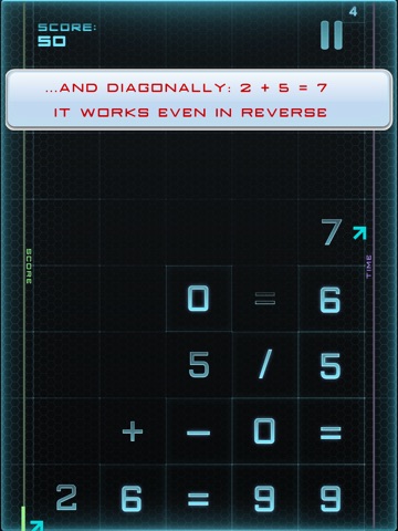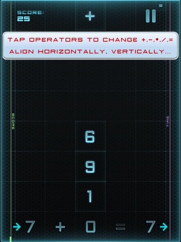 Digitron game exercises math skills by asking player to quickly combine numbers and operators to solve common arithmetic problems.