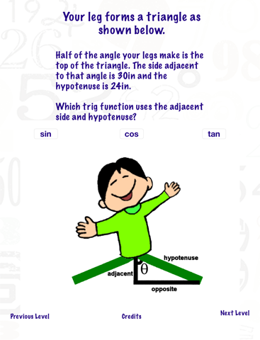 As part of martial arts training, "doing the splits" involves angles and trigonometry. This app enables you to train your mind and your body at the same time by prompting you to consider the math involved in the splits.