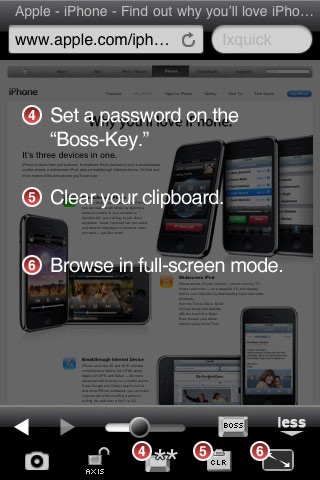 Keep your browsing private. Here are special touches this app has: ✭ Screen dimmer to prevent unwanted onlookers ✭ A "Boss Key" that instantly blanks your screen ✭ Automatic "Boss Key" when your phone goes to sleep (to avoid the "tape left in the VCR" problem) ✭ Complete piece-of-mind as NO cookies, history, URL history are saved when you exit ✭ Tested on hundreds of video and image sites ✭ Buy once, run on both iPad and iPhone ✭ Choose from different search engines, including IxQuick, which doesnt record your IP ✭ Never "dials home" or shows any ads ✭ Discrete and dull looking icon and app name ✭ Tested on a hundreds of image and video sites ✭ Clipboard cleaner ✭ Full-screen browsing ✭ Take both regular and double-sized screenshots of pages ✭ Password-settable "Boss Key" ✭