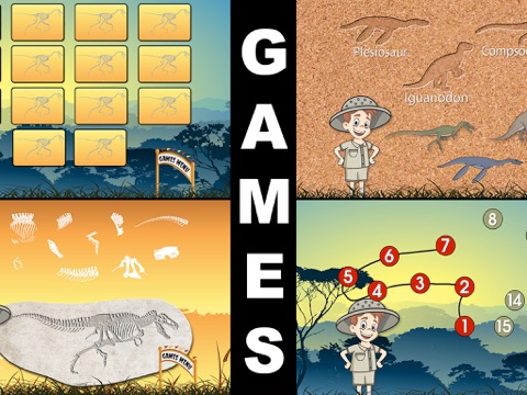Over 60 Dinosaur games –Memory match, 15 dinosaur skeleton puzzles, 15 dinosaur skeleton connect the dots, 15 color dinosaur connect the dots, 10 matching dinosaur to name, 4 Create a Scene