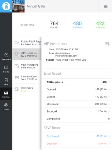 - View RSVP reports for guest responses (confirmed/declined) and answers to questionnaires