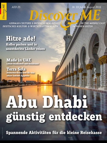 Discover Middle East Magazine (DiscoverME) ist das erste deutschsprachige Kultur- und Wirtschaftsmagazin im Nahen Osten. DiscoverME wird von deutschen Journalisten produziert und sowohl in den Vereinigten Arabischen Emiraten (VAE) als auch in Deutschland vertrieben. Durch eine professionelle Berichterstattung vor Ort kann somit ein aktueller und authentischer Informationsfluss gewährleistet werden. Wir spüren neue Trends des Nahen Ostens auf, analysieren diese und bereiten Informationen für unsere deutsche Leserschaft auf. So werden die neusten wirtschaftlichen, kulturellen und sportlichen Ereignisse für die Leserschaft aktuell aufbereitet. DiscoverME will durch eine objektive Berichterstattung aus deutscher Sicht den Facettenreichtum des Nahen Ostens wiedergeben. Die zweimonatlichen Ausgaben sollen helfen, einen objektiven Einblick in das Leben im Nahen Osten zu geben. Wir verstehen uns als Botschafter zwischen den Kulturen und versuchen, Neuankömmlingen den Start in den Emiraten zu erleichtern.