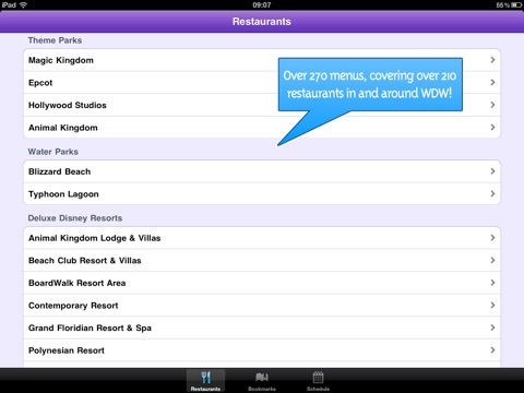 Disney World Dining Planner contains menus for over 200 Disney World restaurants! Weve got all the details youll ever need about each restaurant location. You can add your scheduled dining reservation details into the app and bookmark your favorite places.