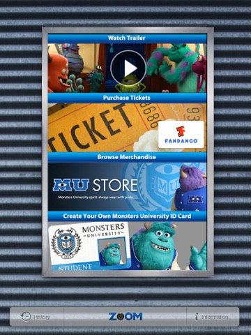 To get started, install the app on your mobile device and point the camera at any of the select Disney displays. The Disney Zoom app will automatically recognize the displays and provide you with options to interact with the displays, watch trailers, explore special experiences, purchase Disney products and buy movie tickets. If you run out of time, not a problem! Disney Zoom’s “History” feature gives you access to your scanned items so you can interact later. Remove the images from History with ease.