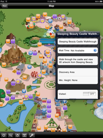 * Wait time support is included. Times can be entered for both restaurants and attractions. Times are shown on the maps for a quick overview.