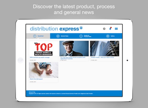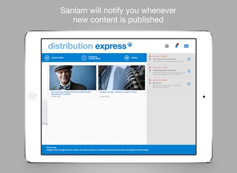 Distribution Express brings financial advisers and accredited brokers fast updates on the latest Sanlam process and product news, as well as business news relevant to client conversations. Whether you use a laptop, mobile device or tablet, Sanlam’s product innovation, marketing campaigns, fund performance figures and investment tips are presented in an accessible and dynamic manner, boosting your sales process!