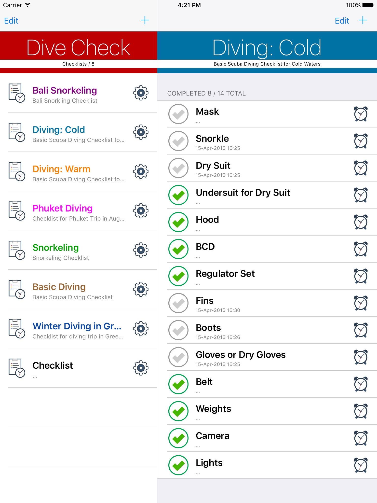 Did you ever want to send a list of equipment to your dive buddy or friend, so they dont forget something on the next diving trip? With Dive Check you can create a list and share it with as many friends as you want to, set reminders, and never miss a dive due to forgotten equipment or gear.