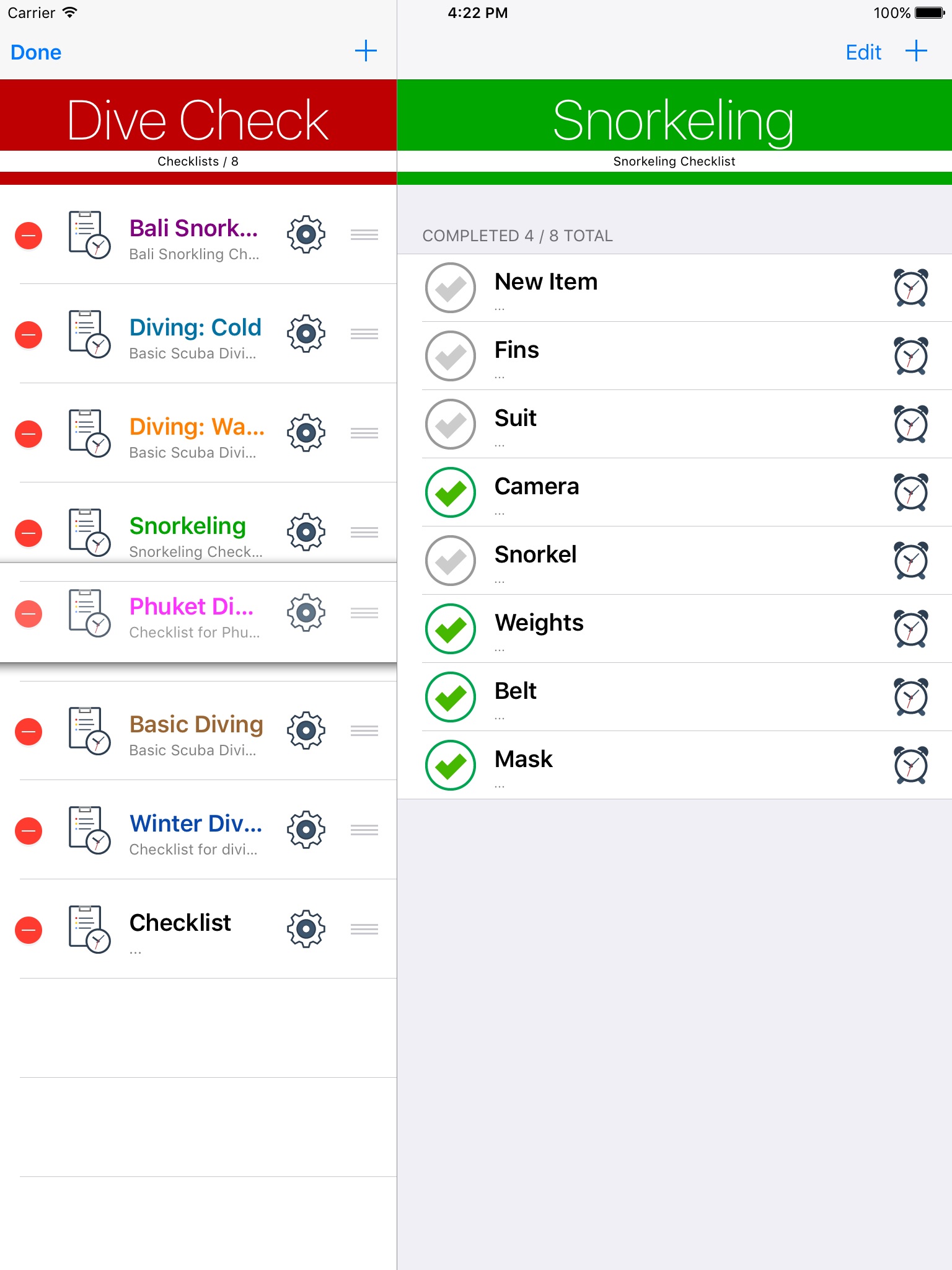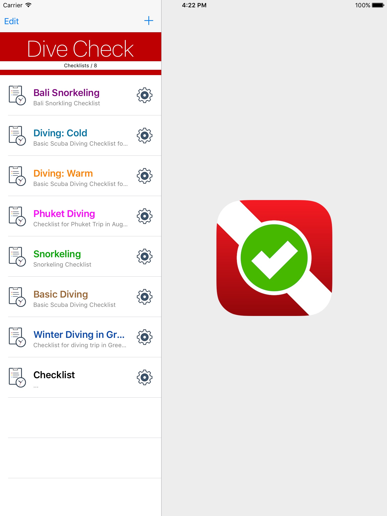 Dive Check is useful and simple to use application for creating checklists for scuba divers, technical divers, snorkelers and everyone else who carries a lot of gear on locations, and needs to make sure that nothing is forgotten, or misplaced.