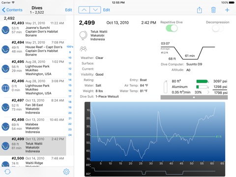 Enfin un carnet de plongée digne de ce nom sur liphone. Très complet, je nai mis cependant que 4 étoiles du fait de grands manques du coté des statistiques, comme : Des infos sur le nombre de plongées avec un binôme donné. La liste des plongées avec tel ou tel plongeur Désignation de lencadrant si il y en a un. Saisie pas toujours évidente. Stats avec peu dinformation. Sinon super appli. Problème : il y a une grosse lacune avec cette application. Vous avez tout pour convertir des infos de programmes Mac vers liphone, mais avec pertes de certaines, mais surtout le problème cest quil ny a rien dans le sens inverse. Ainsi toute modification faire sur lappli iPhone ne sera pas répercutée sur lappli Mac. Du coup, beaucoup moins dintérêt davoir cette application, hormis voir les courbes. Dommage...