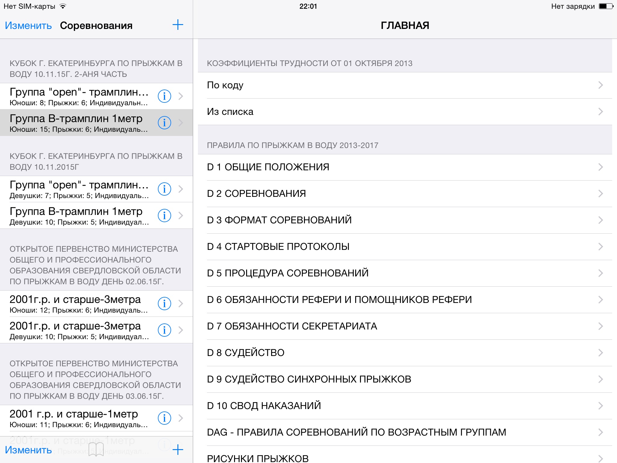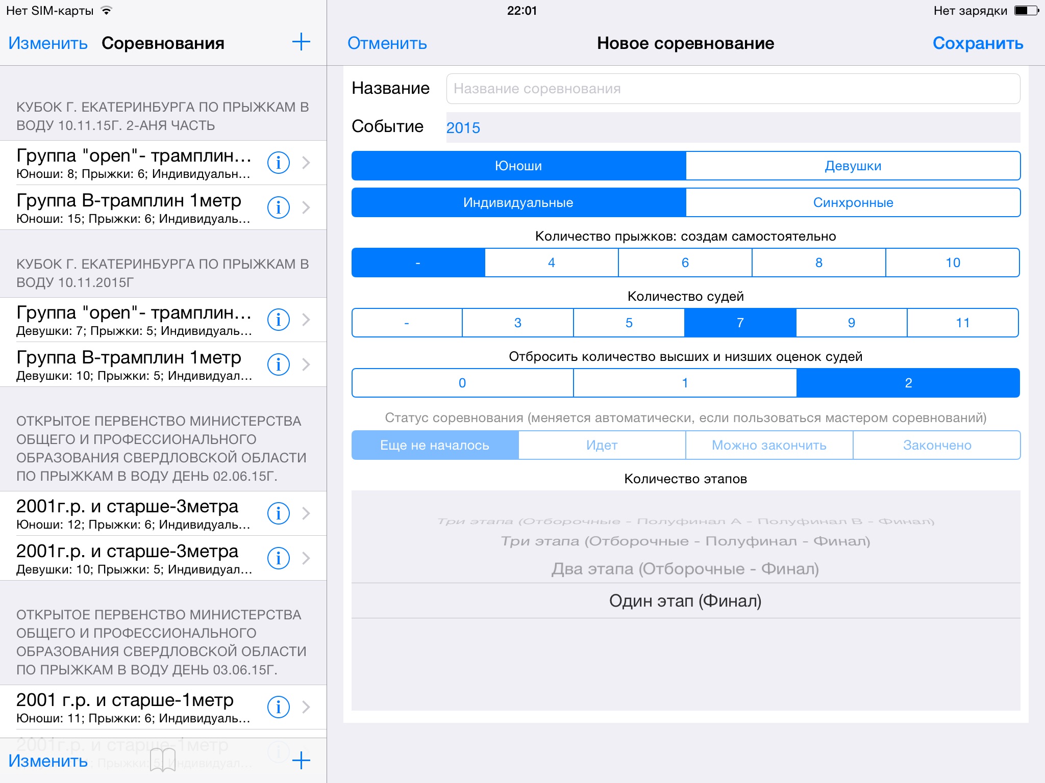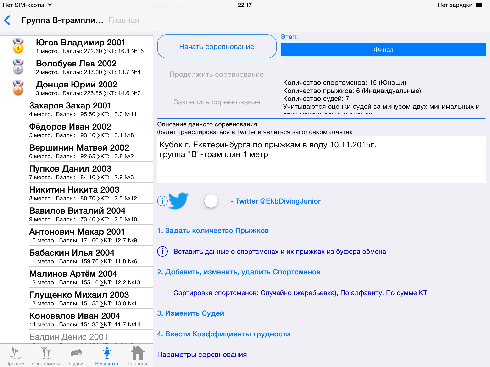 With the help of this program coaches, parents and spectators have opportunity to enter judges scores, see intermediate total of dives (preliminary place distribution of performed dives and in iPad version, additionally, distribution of a performing dive) and total score of the competition.