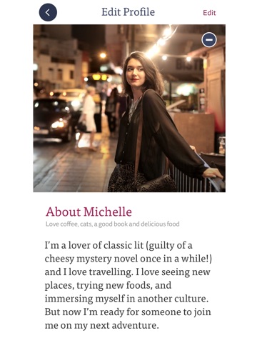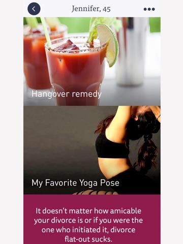 o A series of fun and quick profile questions to help facilitate matches. The questions, culled from Vikki’s experience as a divorce attorney and her understanding of why marriages don’t always work out, range from the more serious (Why did you divorce? What has divorce taught you?) to the lighthearted (What movie best describes your divorce? Would you run naked in a rainstorm?)