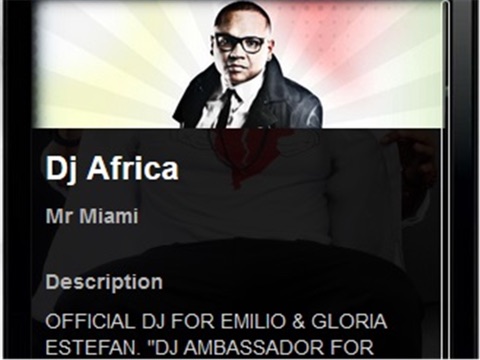 DJ AFRICA is the official DJ of the after parties as major awards are the LATIN GRAMMYS and LATIN BILLBOARDS, and thats why, In some countries is known as "DJ OF THE STARS". Exclusive DJ of EMILIO and GLORIA ESTEFAN, and as such the resident DJ of world-famous CLUB BONGOS CUBAN CAFE in Miami.
