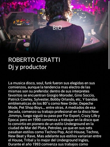 App de Roberto Ceratti, A.K.A. Dj Ceratti, con toda la información de sus presentaciones, link directo a sus nuevos tracks que podes escuchar y comprar via Beatport y sets mensuales con lo mejor de su batea que podes escuchar online.