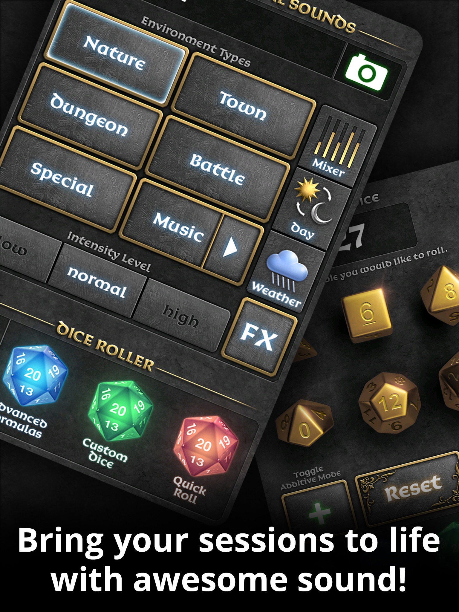 Good selection of sounds, high sound quality, etc. Id like to have the option to play the audio in the background so I can consult rules and save battery power. More sci-fi sounds like lasers, blasters, a few button sounds would be nice too.
