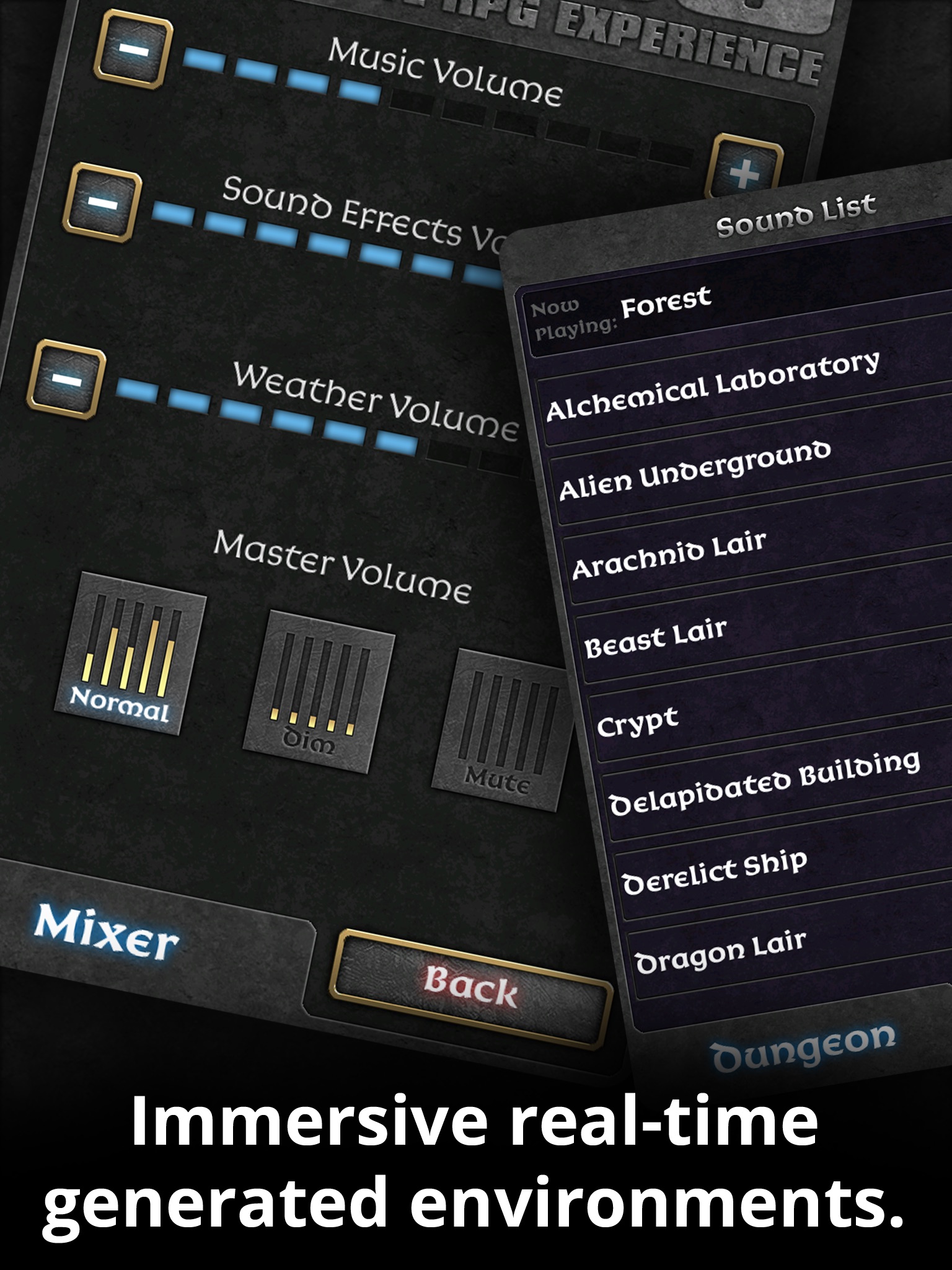 I took a chance on this app hoping that it would provide me with situational music for our DnD campaign, turns out the music doesnt change when you change environments. Its one generic tune the whole time.