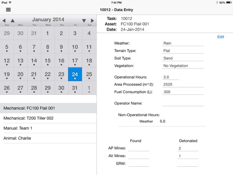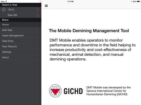 The Demining Management Tool App was created based on an earlier excel based version. It works best on iPad and iPad Mini and is designed to be user friendly and complement existing reporting procedures. Operational data (including downtime and cause) is recorded daily for each asset, resulting in a set of reports that highlight operational inefficiency.