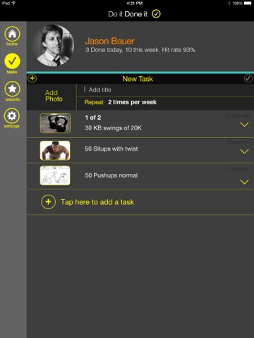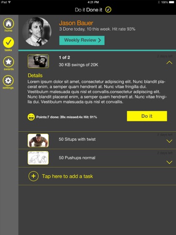 Once you have momentum keep it up. Your stats will show you where you’re at so you can adjust. First create some tasks. We’ll remind you to check your ‘Do It’ list everyday so you can knock a few items off. At the end of the week check back to see how you did.