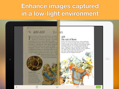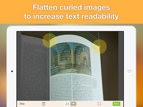 It automatically detects document edges and surface in a picture, dewarp curved surface, correct perspective distortion, remove shadows and brighten it up to produce a clear and sharp document, especially useful in a low-light environment.